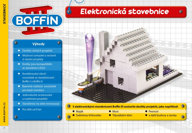 Se stavebnicí Boffin III se dozvíte, jak propojit stavebnici Boffin s kostkami, abyste si sestavili několikapatrové domy a další reálné budovy. Stavebnice obsahuje 200 součástek, z nichž lze postavit projekty: